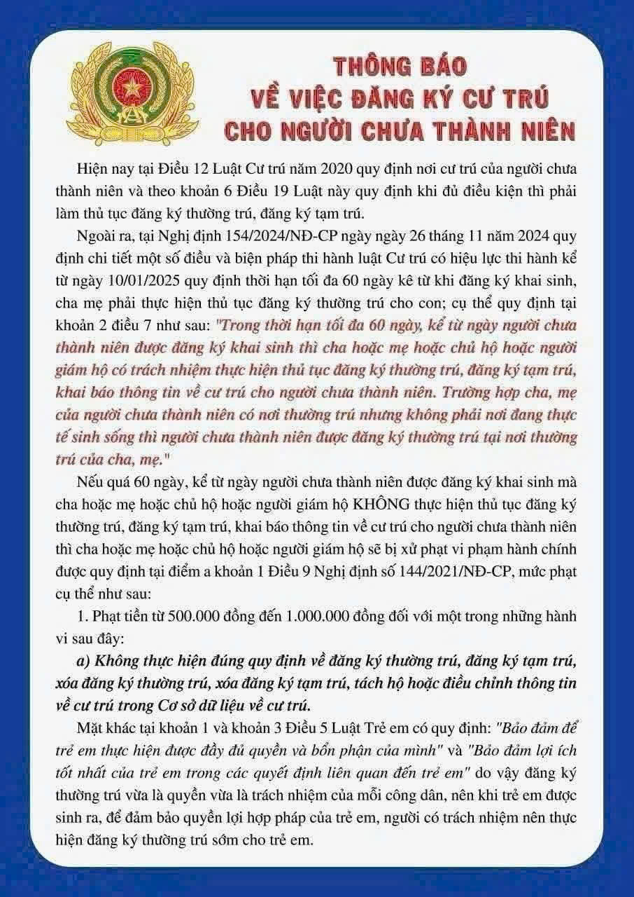 Thông báo về việc đăng ký cư trú cho người chưa thành niên