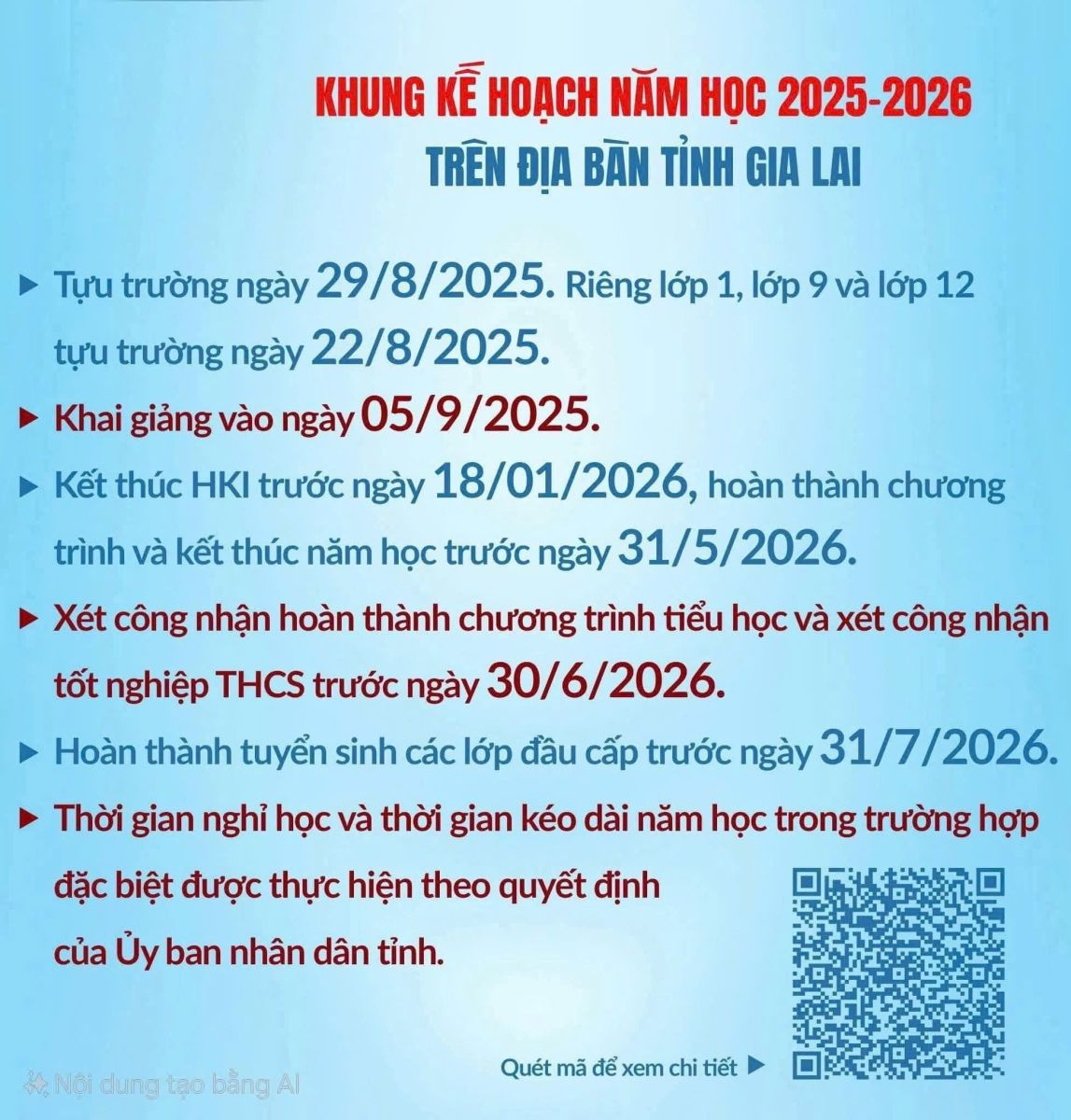 UBND tỉnh đã ban hành Quyết định số: 1501/QĐ-UBND, ngày 20 tháng 8 năm 2025 về khung kế hoạch thời gian năm học 2025-2026 đối với giáo dục Mần non, giáo dục phổ thông và giáo dục thường xuyên trên địa bàn tỉnh Gia Lai.